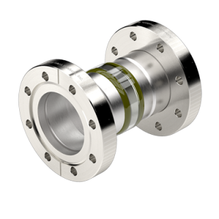 7740 Pyrex Glass Adapter, 2.50 Diameter with open tube and dual 4.50 CF Flanges. Glass tube is hermetically sealed to stainless steel sleeves and welded into standard stainless steel CF flanges.