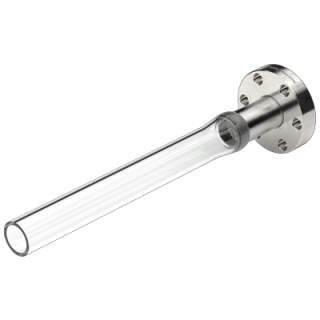 0.50 Diameter open-end 7052 Borosilicate glass adapter mounted to a 1.33 CF Mini Flange. Glass tube is hermetically sealed to a magnetic Kovar (NiFeCo) tube and welded into a standard stainless steel CF flange.