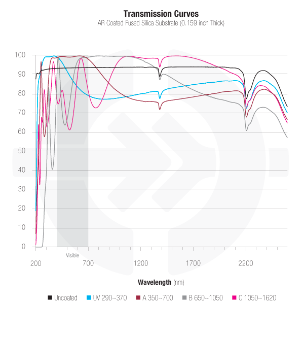Windows are available uncoated (185~2100 nm) or with one of four low-loss broadband anti-reflection coatings. Coatings are deposited on both optical surfaces and are optimized for the following ranges: UV (290~370 nm), A (350~700 nm), B (650~1050 nm), and C (1050~1620 nm). While uncoated windows have typical losses of about 4% per surface, the AR coatings reduce this to Ravg < 0.5%. We have designed these AR coatings for angles of incidence between 0° and 30°.